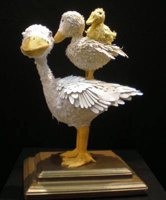The feathers are all paper. The downy feathers are tiny pieces of torn tissue paper, and/or hand made paper. The wings are individually cut from watercolor paper and handmade paper, and then individually glued in place onto paper mache forms of the goose and ducks with tweezers.