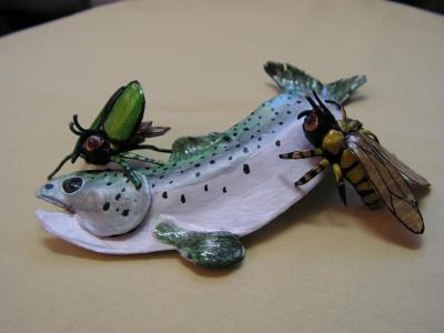 The insects have pm bodies and cartonnage details. The fish has a pm-over-wire core, and cartonnage skin and fins. All are painted with acrylic craft paints. The insect wings are layers of packing tissue laminated with Modge Podge glue.