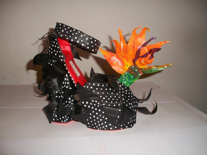 SHOE MADE WITH PAPIER MACHE AND BEADS.