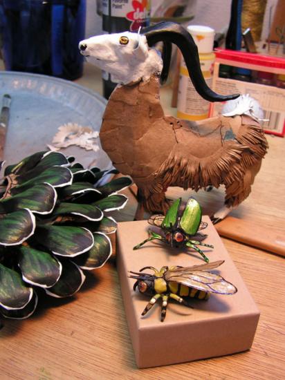 Working on a life-sized rooster is like counting ants, repetitious (lots of feathers)...so for a break, tiny things like bugs or a little goat.