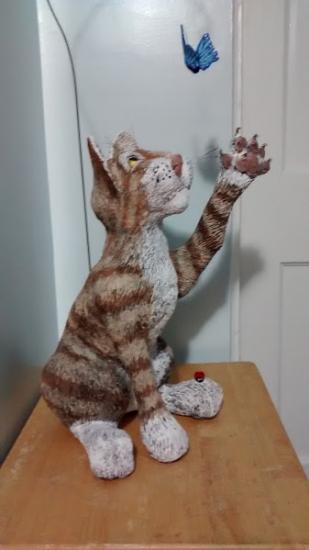 I finally finished my cat, He is made from paper mache with a paper clay coating for details. He is trying to reach a butterfly (paper clay) which is hanging on some fishing line. He also has a ladybug on one of his paws :-)
