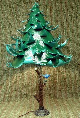 My husband made a lamp stand with welded carbon steel a few years back. I have just finished the lampshade. Using a lampshade found at a thrift store, I have layered newspaper strips and painted it to give it a whimsical fir tree effect. The little bluebird is also made from newspaper and paint.
