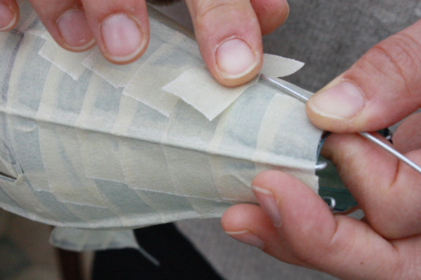 Cut wire that is about three inches (75mm) longer than the central line of each petal. Hold it in place with masking tape with about half an inch of wire (12mm) protruding at the petal tip.